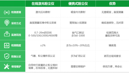 相较于便携式粉尘仪,艾伊科技的在线粉尘浓度检测仪具有显著优势。它能够实现24小时不间断监测,实时反馈粉尘浓度数据,一旦浓度超标,立即发出警报,有效预防安全事故的发生。同时,该仪器采用先进的传感技术,测量精准,误差小,为企业的安全生产提供了有力保障。以下是优势对比图: